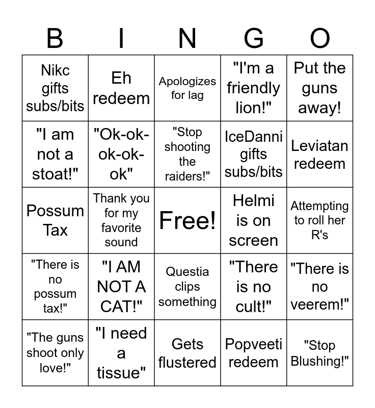 This bingo card has a free space and 53 words: Welcome In Raiders Speach, "Stop Blushing!", "JIMMY!!!", Popveeti redeem, "I AM NOT A CAT!", "Eh?" (Not redeem), Eh redeem, "I am not smol!", "I am not a stoat!", BONK, "Ok-ok-ok-ok-ok", "We don't talk about the catnip", "There is no veerem!", "There is no cult!", "There is no gang!", "The guns shoot only love!", "Stop shooting the raiders!", Helmi is on screen, Kimi offers legs, Put the guns away!, Thank you for my favorite sound, Jumpscared by sound alert, IceDanni gifts subs/bits, Nikc gifts subs/bits, Starraider gifts subs/bits, "I need a tissue", "Little Lioness' room", "Daily no thank you.", Ara Ara redeem, Leviatan redeem, "There is no throne!", Complaining about ISP, Mentioning Saint Umber, "Stop it!" in reference to donos/gift subs, "Hi Abul! Awa awa", "I do not eat the doordashers!", "I'm a friendly lion!", Gets flustered, Apologizes for lag, "I was muted!", Nomming on food., Makes gun noises, Attempting to roll her R's, "Welcome in first time chatter", "Stop linking that clip!", Questia clips something, Someone gets 101 veeb, Triggered by Bear Traps, Possum Tax, "There is no possum tax!", Forgets Stream Raiders, Veeti Misses a "Can Vee Say" redeem and Someone buys a Stream Raiders skin.