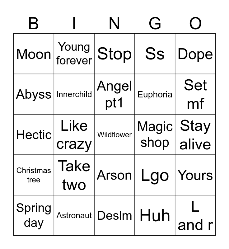 This bingo card has 25 words: Take two, Deslm, Angel pt1, Spring day, Dope, Moon, Abyss, Young forever, Magic shop, Arson, Euphoria, Hectic, Lgo, Yours, Innerchild, L and r, Stay alive, Stop, Set mf, Like crazy, Wildflower, Astronaut, Christmas tree, Ss and Huh.
