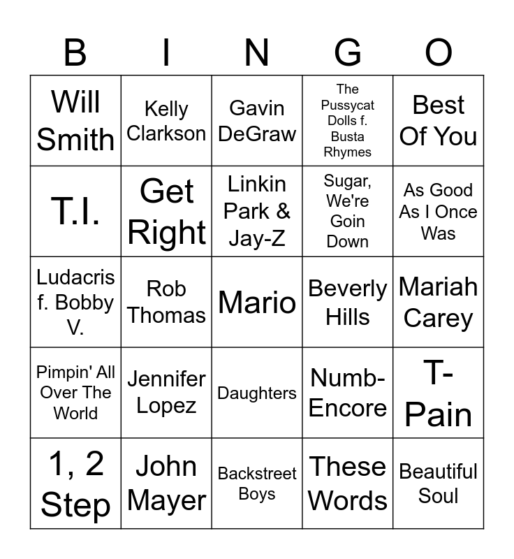 This bingo card has 94 words: Akon, Lonely, Backstreet Boys, Incomplete, Chris Brown f. Juelz Santana, Run It, Ciara f. Missy Elliott, 1, 2 Step, Destiny's Child, Cater 2 U, Eminem, Mockingbird, Fall Out Boy, Sugar, We're Goin Down, Foo Fighters, Best Of You, Gavin DeGraw, I Don't Want To Be, Gorillaz, Feel Good Inc., Green Day, Boulevard Of Broken Dreams, Gwen Stefani, Hollaback Girl, Jennifer Lopez, Get Right, Jesse McCartney, Beautiful Soul, John Legend, Ordinary People, John Mayer, Daughters, Kanye West f. Jamie Foxx, Gold Digger, Kelly Clarkson, Since U Been Gone, Lifehouse, You And Me, Linkin Park & Jay-Z, Numb-Encore, Ludacris f. Bobby V., Pimpin' All Over The World, Mariah Carey, We Belong Together, Mario, Let Me Love You, Maroon 5, She Will Be Loved, Missy Elliott f. Ciara & Fat Man Scoop, Lose Control, Natasha Bedingfield, These Words, Nelly f. Tim McGraw, Over And Over, Nickelback, Photograph, Papa Roach, Scars, Rihanna, Pon de Replay, Rob Thomas, Lonely No More, Sean Paul, We Be Burnin', Shakira f. Alejandro Sanz, La Tortura, Snoop Dogg f. Pharrell Williams, Drop It Like It's Hot, T.I., Bring Em Out, The Black Eyed Peas, Don't Phunk With My Heart, The Killers, Mr. Brightside, The Pussycat Dolls f. Busta Rhymes, Don't Cha, Toby Keith, As Good As I Once Was, T-Pain, I'm Sprung, Usher, Caught Up, Weezer, Beverly Hills, Will Smith, Switch, Ying Yang Twins, Wait (The Whisper Song), Young Jeezy f. Akon, Soul Survivor, 3 Doors Down, Let Me Go, 50 Cent f. Olivia and Candy Shop.
