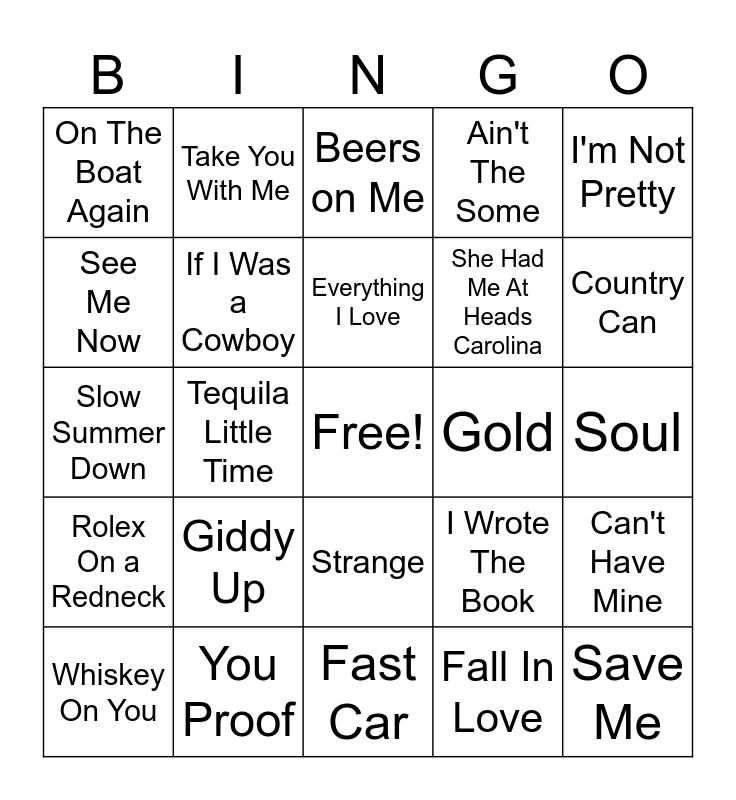 This bingo card has a free space and 24 words: Giddy Up, You Proof, Everything I Love, Whiskey On You, I'm Not Pretty, On The Boat Again, See Me Now, Take You With Me, Gold, Strange, She Had Me At Heads Carolina, Slow Summer Down, I Wrote The Book, Can't Have Mine, If I Was a Cowboy, Fall In Love, Soul, Beers on Me, Country Can, Tequila Little Time, Save Me, Rolex On a Redneck, Ain't The Some and Fast Car.