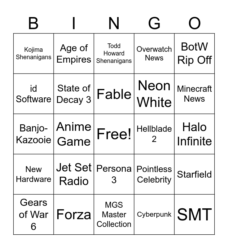This bingo card has a free space and 24 words: Jet Set Radio, Forza, Fable, Gears of War 6, BotW Rip Off, Kojima Shenanigans, id Software, Age of Empires, Hellblade 2, Persona 3, Neon White, Banjo-Kazooie, Pointless Celebrity, Starfield, State of Decay 3, Cyberpunk, Halo Infinite, Todd Howard Shenanigans, Minecraft News, Anime Game, SMT, New Hardware, Overwatch News and MGS Master Collection.