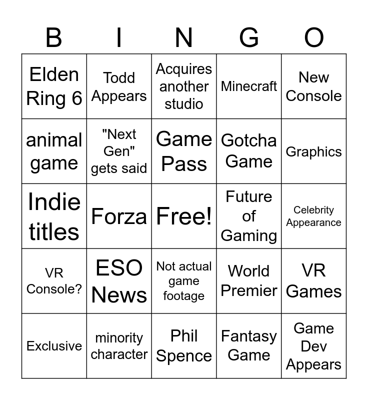 This bingo card has a free space and 24 words: ESO News, minority character, Game Pass, Exclusive, New Console, Elden Ring 6, animal game, Todd Appears, Future of Gaming, Not actual game footage, Gotcha Game, Indie titles, World Premier, VR Games, "Next Gen" gets said, Fantasy Game, Celebrity Appearance, Acquires another studio, Graphics, Forza, Game Dev Appears, VR Console?, Minecraft and Phil Spence.