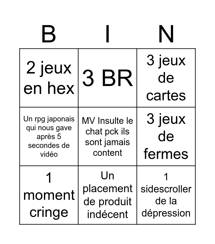 This bingo card has a free space and 8 words: 3 jeux de fermes, 3 jeux de cartes, 3 BR, 1 moment cringe, 2 jeux en hex, 1 sidescroller de la dépression, Un rpg japonais qui nous gave après 5 secondes de vidéo and Un placement de produit indécent.
