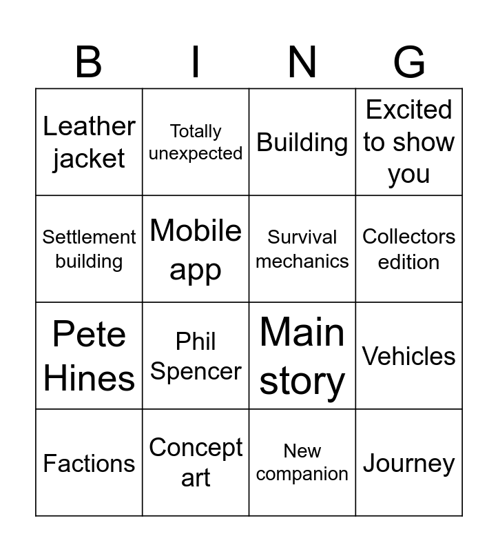This bingo card has 18 words: Phil Spencer, Journey, Building, Leather jacket, Main story, Excited to show you, Factions, Totally unexpected, Collectors edition, Pete Hines, New companion, Settlement building, Vehicles, Mobile app, Survival mechanics, Space combat, Concept art and Weapon customisation.