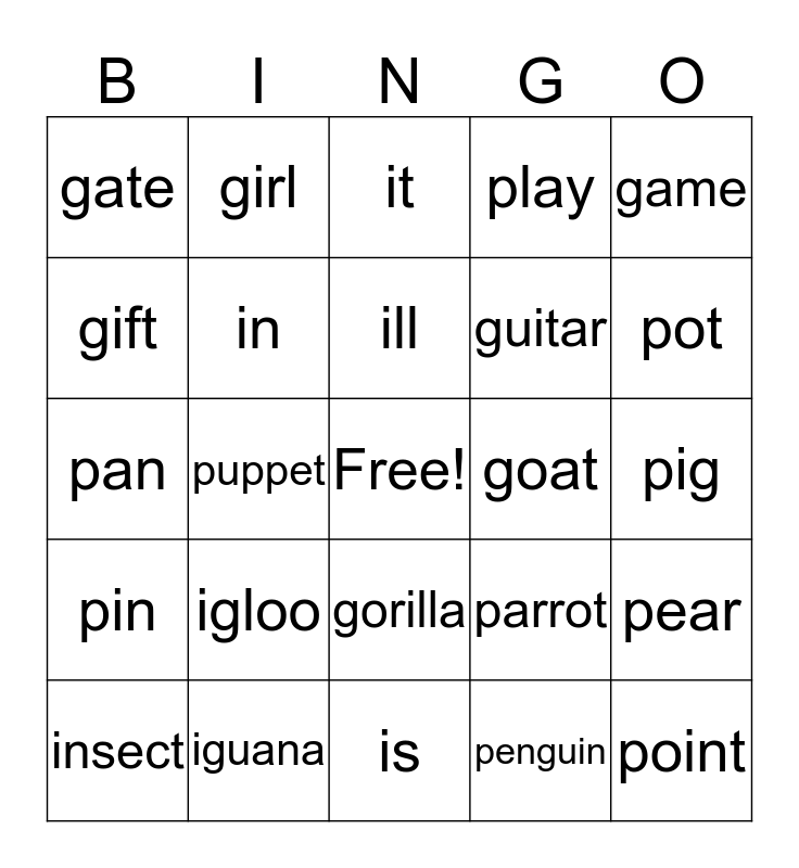 This bingo card has a free space and 24 words: igloo, iguana, ill, insect, game, gate, gift, girl, goat, gorilla, guitar, pan, parrot, pear, in, penguin, pig, it, pot, puppet, point, pin, play and is.