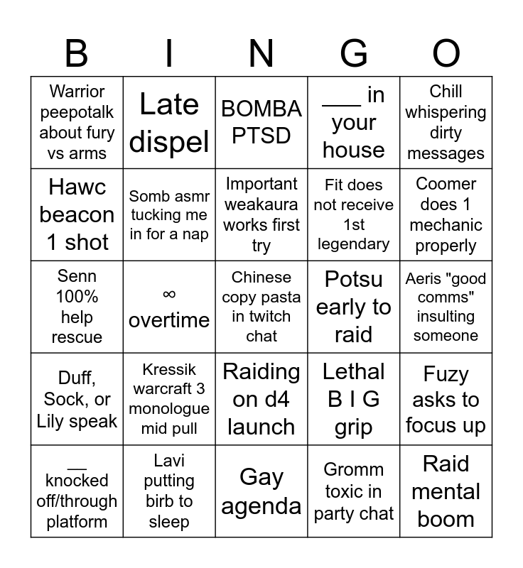This bingo card has a free space and 24 words: Kressik warcraft 3 monologue mid pull, Lavi putting birb to sleep, Important weakaura works first try, __ knocked off/through platform, Chill whispering dirty messages, Warrior peepotalk about fury vs arms, Hawc beacon 1 shot, Late dispel, Potsu early to raid, Raiding on d4 launch, Fit does not receive 1st legendary, Senn 100% help rescue, Lethal B I G grip, Fuzy asks to focus up, Somb asmr tucking me in for a nap, Gromm toxic in party chat, Aeris "good comms" insulting someone, BOMBA PTSD, Coomer does 1 mechanic properly, ∞ overtime, Raid mental boom, Duff, Sock, or Lily speak, ___ in your house and Gay agenda.