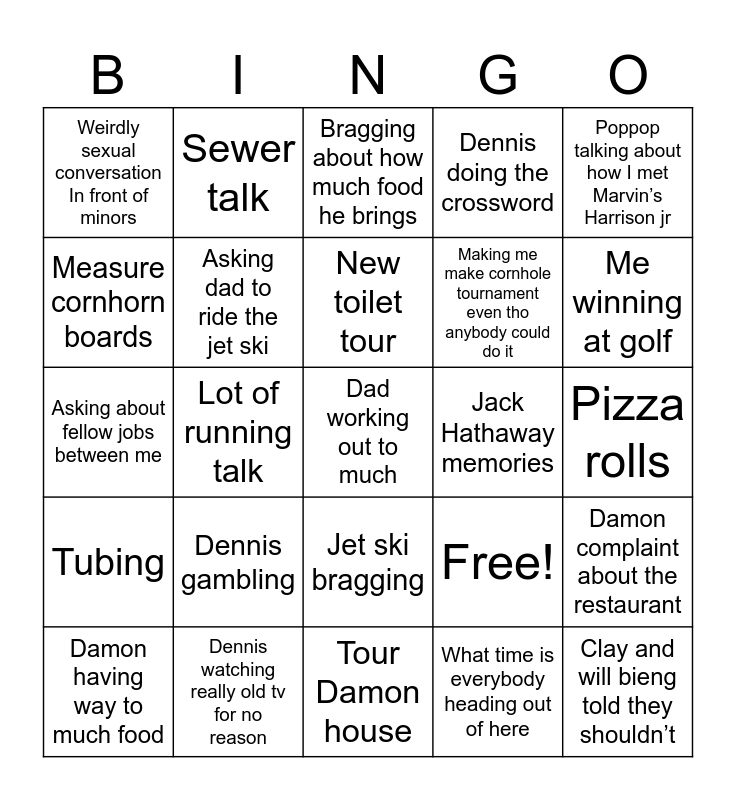 This bingo card has 25 words: Dennis gambling, Tour Damon house, New toilet tour, Damon having way to much food, Poppop talking about how I met Marvin’s Harrison jr, Weirdly sexual conversation In front of minors, Measure cornhorn boards, Sewer talk, Jack Hathaway memories, Jet ski bragging, Making me make cornhole tournament even tho anybody could do it, Asking about fellow jobs between me, Free!, Damon complaint about the restaurant, Asking dad to ride the jet ski, Clay and will bieng told they shouldn’t, Pizza rolls, Bragging about how much food he brings, Me winning at golf, Lot of running talk, Dad working out to much, Dennis watching really old tv for no reason, Tubing, Dennis doing the crossword and What time is everybody heading out of here.
