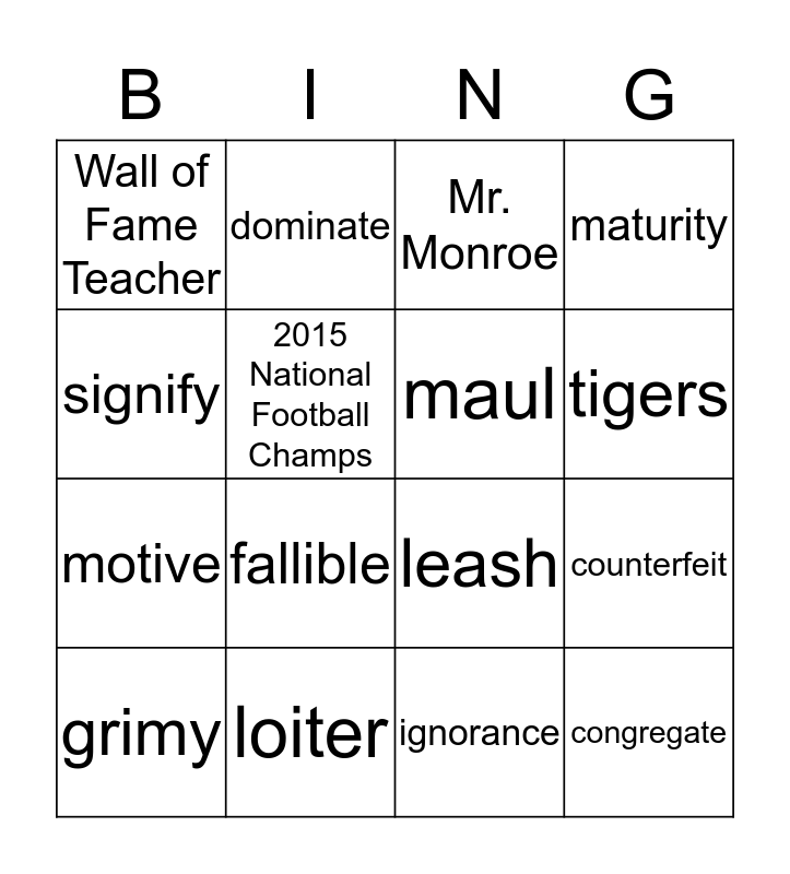 This bingo card has a free space and 19 words: congregate, supervise, Mr. Monroe, hover, counterfeit, signify, ignorance, Wall of Fame Teacher, dominate, motive, fallible, 2015 National Football Champs, maul, loiter, grimy, haunt, maturity, tigers and Mr. Kirby.