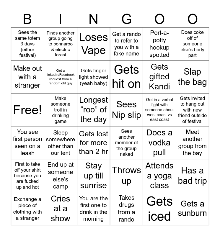This bingo card has 36 words: Throws up, Stay up till sunrise, Takes drugs from a rando, Make out with a stranger, You see first person seen on a leash, Sees Nip slip, Get a linkedin/Facebook request from a random old guy, You are the first one to drink in the morning, Port-a-potty hookup spotted, Attends a yoga class, Slap the bag, Get a rando to refer to you with a fake name, Has a bad trip, Make someone troll in drinking game, Gets hit on, Sees the same totem 3 days (either festival), First to take off your shirt because you are fucked up and hot, Get in a verbal fight with someone about west coast vs east coast, Free!, Loses Vape, Longest “roo” of the day, Sleep somewhere other than our tent, Sees another member of the group naked, Gets lost for more than 2 hr, Does a vodka pull, Finds another group going to bonnaroo & electric forest, Gets gifted Kandi, Cries at a show, Gets finger light showed (yeah baby), Does coke off of someone else's body part, Gets a sunburn, Exchange a piece of clothing with a stranger, Meet another group from the bay, Gets invited to hang out with new friend outside of festival, End up at someone else’s camp and Gets iced.