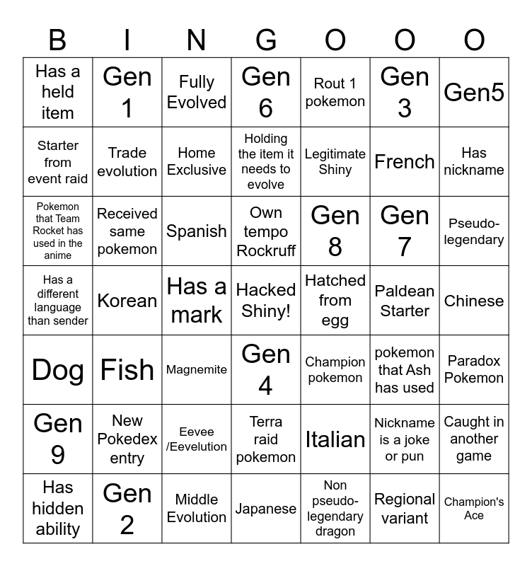 This bingo card has a free space and 48 words: Italian, French, Japanese, Korean, Spanish, Chinese, Gen 1, Gen 2, Gen 3, Gen 4, Gen5, Gen 6, Gen 7, Gen 8, Gen 9, Paldean Starter, Starter from event raid, Has nickname, Nickname is a joke or pun, Rout 1 pokemon, Legitimate Shiny, Has a mark, Has a held item, Trade evolution, Caught in another game, Home Exclusive, Pseudo-legendary, Has hidden ability, Own tempo Rockruff, Received same pokemon, Regional variant, Hatched from egg, Paradox Pokemon, New Pokedex entry, Has a different language than sender, Champion pokemon, pokemon that Ash has used, Pokemon that Team Rocket has used in the anime, Magnemite, Eevee /Eevelution, Dog, Champion's Ace, Fully Evolved, Middle Evolution, Holding the item it needs to evolve, Terra raid pokemon, Fish and Non pseudo-legendary dragon.