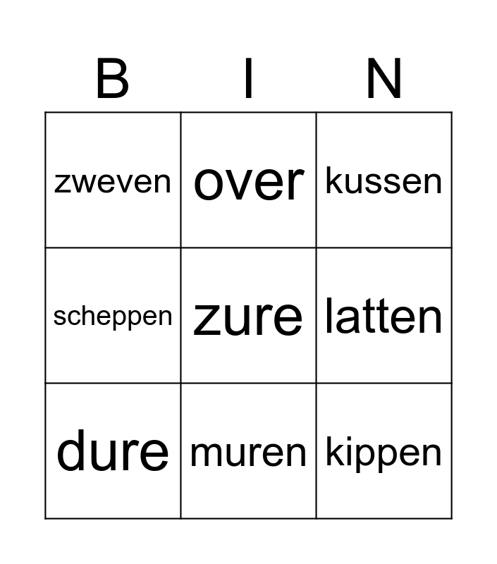 This bingo card has 25 words: apen, zatte, muren, dikke, zure, zweven, latten, over, bussen, negen, kippen, knagen, trappen, knollen, dure, volle, beven, kussen, regen, klimmen, peren, petten, open, scheppen and konijn.