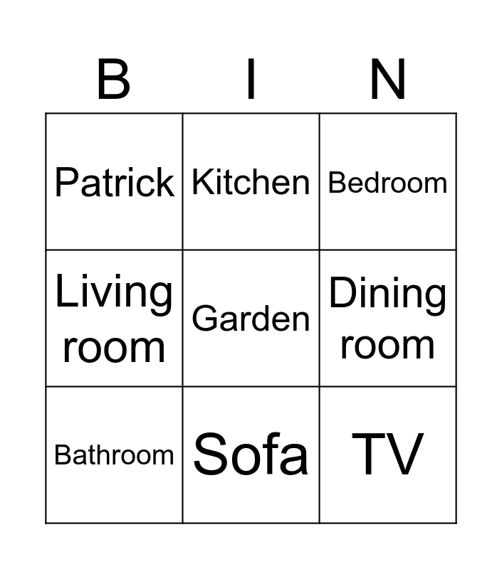 This bingo card has 9 words: Bathroom, Bedroom, Kitchen, Living room, Patrick, Dining room, Garden, TV and Sofa.