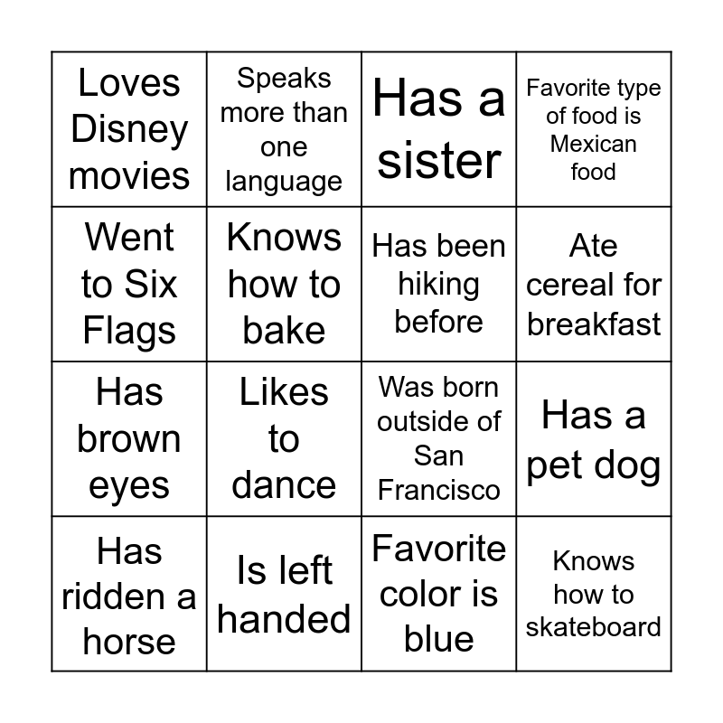 This bingo card has 16 words: Has ridden a horse, Is left handed, Has a sister, Favorite type of food is Mexican food, Went to Six Flags, Speaks more than one language, Was born outside of San Francisco, Has a pet dog, Loves Disney movies, Knows how to bake, Favorite color is blue, Ate cereal for breakfast, Has brown eyes, Likes to dance, Has been hiking before and Knows how to skateboard.