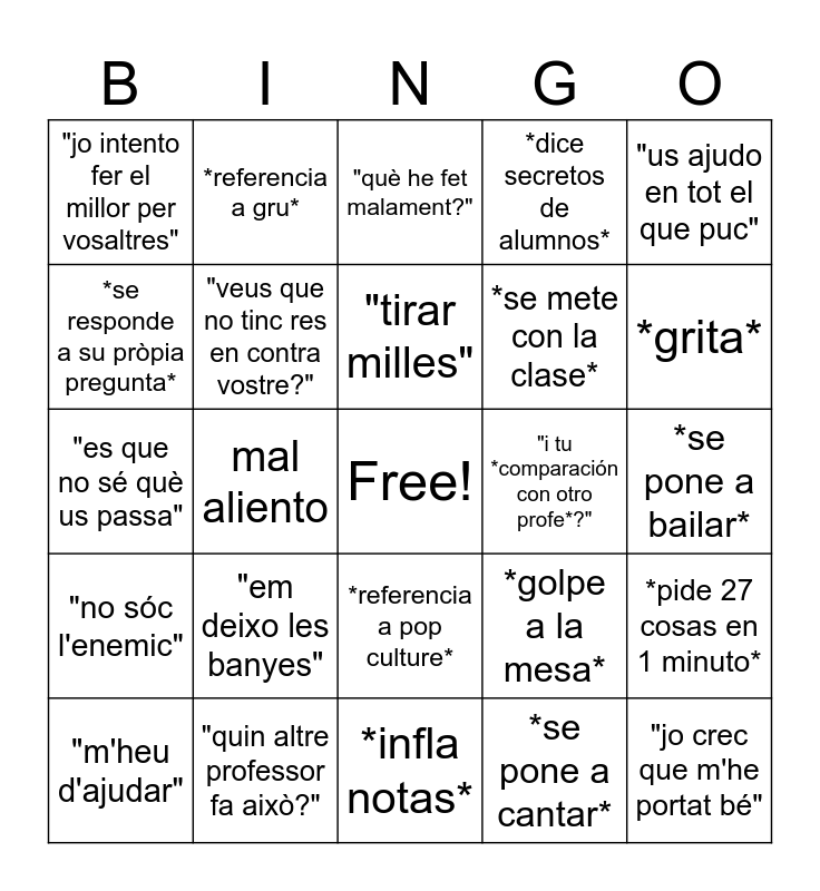 This bingo card has a free space and 24 words: "em deixo les banyes", "quin altre professor fa això?", "tirar milles", "m'heu d'ajudar", "us ajudo en tot el que puc", "jo intento fer el millor per vosaltres", *se responde a su pròpia pregunta*, *referencia a gru*, "i tu *comparación con otro profe*?", *referencia a pop culture*, *se mete con la clase*, "es que no sé què us passa", *golpe a la mesa*, *pide 27 cosas en 1 minuto*, "veus que no tinc res en contra vostre?", *se pone a cantar*, *se pone a bailar*, "què he fet malament?", *grita*, mal aliento, "jo crec que m'he portat bé", "no sóc l'enemic", *dice secretos de alumnos* and *infla notas*.