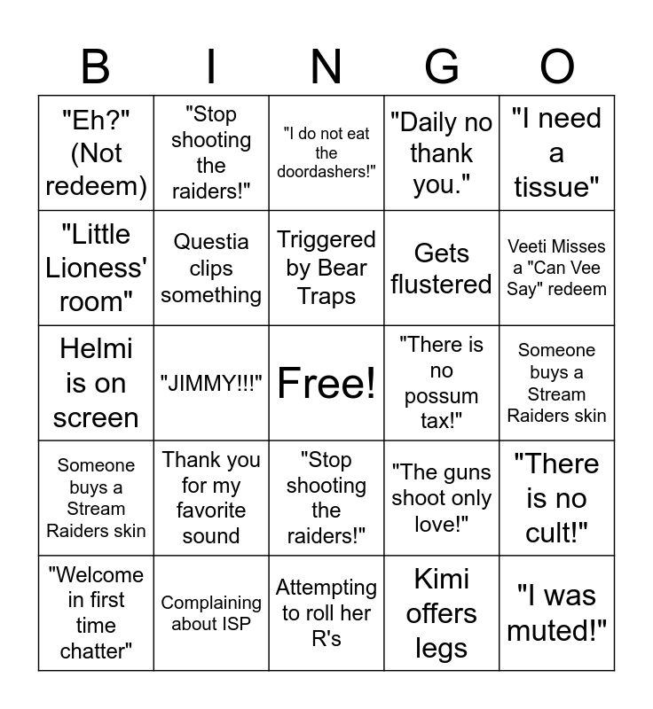 This bingo card has a free space and 108 words: Welcome In Raiders Speech, "Stop Blushing!", "JIMMY!!!", Popveeti redeem, "I AM NOT A CAT!", "Eh?" (Not redeem), Eh redeem, "I am not smol!", "I am not a stoat!", BONK, "Ok-ok-ok-ok-ok", "We don't talk about the catnip", "There is no veerem!", "There is no cult!", "There is no gang!", "The guns shoot only love!", "Stop shooting the raiders!", Helmi is on screen, Kimi offers legs, Put the guns away!, Thank you for my favorite sound, Jumpscared by sound alert, IceDanni gifts subs/bits, Nikc gifts subs/bits, Starraider gifts subs/bits, "I need a tissue", "Little Lioness' room", "Daily no thank you.", Ara Ara redeem, Leviatan redeem, "There is no throne!", Complaining about ISP, Mentioning Saint Umber, "Stop it!" in reference to donos/gift subs, "Hi Abul! Awa awa", "I do not eat the doordashers!", "I'm a friendly lion!", Gets flustered, Apologizes for lag, "I was muted!", Nomming on food., Makes gun noises, Attempting to roll her R's, "Welcome in first time chatter", "Stop linking that clip!", Questia clips something, Someone gets 101 veeb, Triggered by Bear Traps, Possum Tax, "There is no possum tax!", Forgets Stream Raiders, Veeti Misses a "Can Vee Say" redeem, Someone buys a Stream Raiders skin, Veeti blames Rabit for something, Welcome In Raiders Speech, "Stop Blushing!", "JIMMY!!!", Popveeti redeem, "I AM NOT A CAT!", "Eh?" (Not redeem), Eh redeem, "I am not smol!", "I am not a stoat!", BONK, "Ok-ok-ok-ok-ok", "We don't talk about the catnip", "There is no veerem!", "There is no cult!", "There is no gang!", "The guns shoot only love!", "Stop shooting the raiders!", Helmi is on screen, Kimi offers legs, Put the guns away!, Thank you for my favorite sound, Jumpscared by sound alert, IceDanni gifts subs/bits, Nikc gifts subs/bits, Starraider gifts subs/bits, "I need a tissue", "Little Lioness' room", "Daily no thank you.", Ara Ara redeem, Leviatan redeem, "There is no throne!", Complaining about ISP, Mentioning Saint Umber, "Stop it!" in reference to donos/gift subs, "Hi Abul! Awa awa", "I do not eat the doordashers!", "I'm a friendly lion!", Gets flustered, Apologizes for lag, Asveeti forgets to unmute, Nomming on food., Makes gun noises, Attempting to roll her R's, "Welcome in first time chatter", "Stop linking that clip!", Questia clips something, Someone gets 101 veeb, Triggered by Bear Traps, Possum Tax, "There is no possum tax!", Forgets Stream Raiders, Veeti Misses a "Can Vee Say" redeem, Someone buys a Stream Raiders skin and Veeti blames Rabit for something.