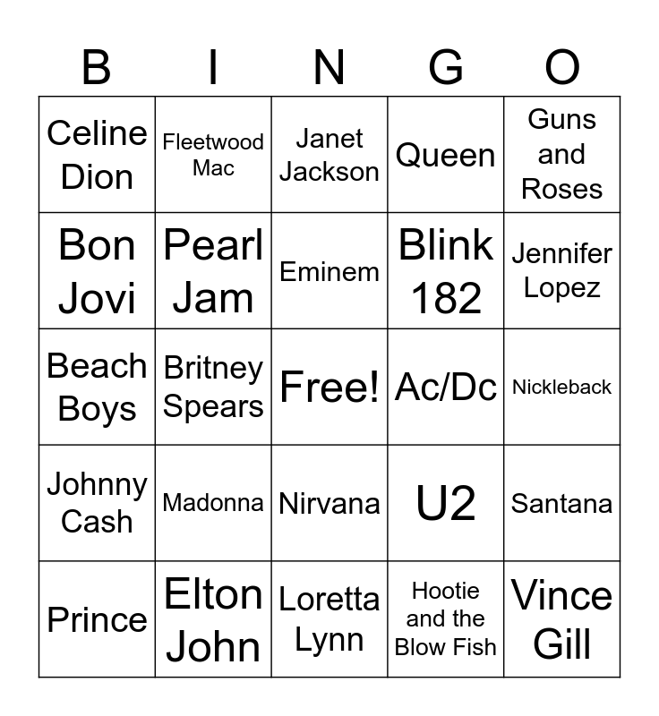 This bingo card has a free space and 24 words: Madonna, Elton John, Eminem, Prince, Guns and Roses, Celine Dion, Bon Jovi, Fleetwood Mac, Ac/Dc, Nirvana, Blink 182, Beach Boys, U2, Santana, Pearl Jam, Hootie and the Blow Fish, Nickleback, Janet Jackson, Jennifer Lopez, Britney Spears, Vince Gill, Johnny Cash, Queen and Loretta Lynn.