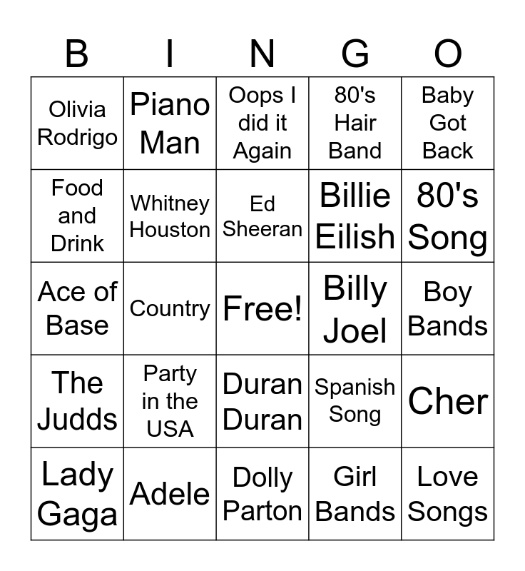 This bingo card has a free space and 24 words: Party in the USA, Adele, Ed Sheeran, Lady Gaga, Baby Got Back, Olivia Rodrigo, Food and Drink, Piano Man, Billy Joel, Duran Duran, Billie Eilish, Ace of Base, Spanish Song, Cher, Whitney Houston, Girl Bands, Boy Bands, Oops I did it Again, 80's Song, Country, Love Songs, The Judds, 80's Hair Band and Dolly Parton.