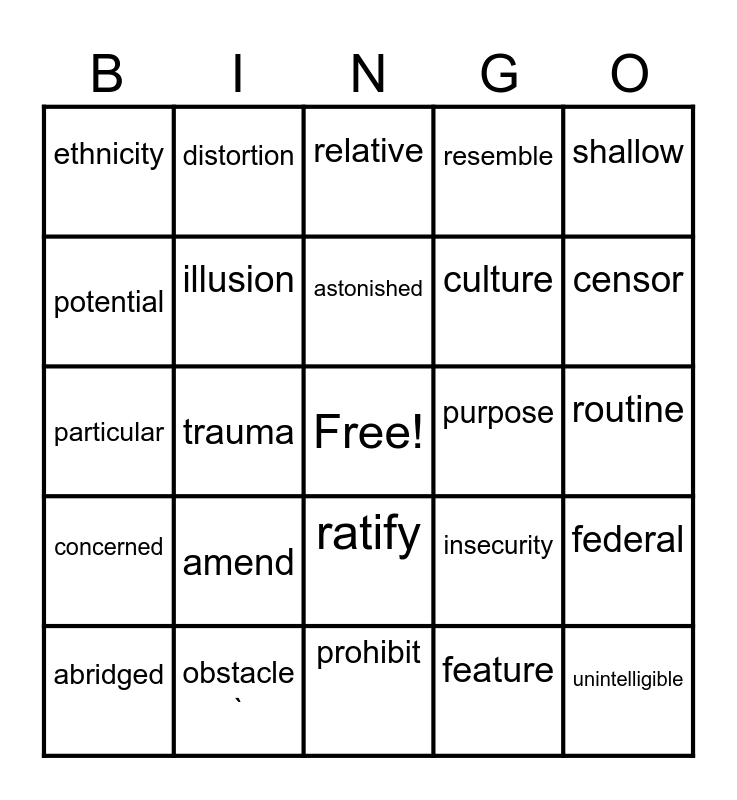 This bingo card has a free space and 24 words: amend, obstacle `, astonished, abridged, shallow, ethnicity, potential, distortion, purpose, ratify, culture, particular, insecurity, federal, illusion, feature, routine, relative, censor, trauma, unintelligible, concerned, resemble and prohibit.