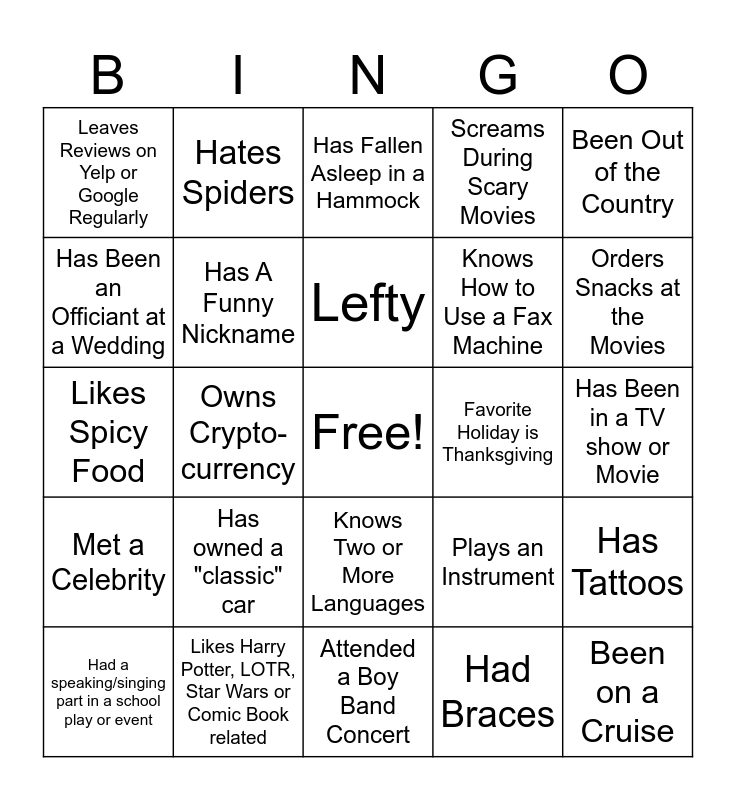 This bingo card has a free space and 39 words: Has a "Zero" Inbox, Ran a marathon, Read 10+ Books This Year, Has A Funny Nickname, Had a speaking/singing part in a school play or event, Knows Two or More Languages, Lefty, Has Broken a Bone, Been Out of the Country, Met a Celebrity, Owns Crypto-currency, Screams During Scary Movies, Been on a Cruise, Has Been in a TV show or Movie, Favorite Holiday is Thanksgiving, Has owned a "classic" car, Named After a Relative, Leaves Reviews on Yelp or Google Regularly, Likes to Play Pranks, Plays an Instrument, Has Been an Officiant at a Wedding, Attended a Boy Band Concert, Knows How to Use a Fax Machine, Orders Snacks at the Movies, Can Drive a Stick, Lived in Another Country, Favorite Color is Blue, Liked Math in School, Can't Swim, Hates Spiders, Doesn't Have Social Media Accounts, Reads Their Horoscope, Has Fallen Asleep in a Hammock, Likes Harry Potter, LOTR, Star Wars or Comic Book related, Had Braces, Never, Has Tattoos, Likes Spicy Food and Prefers Cold Weather.