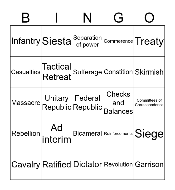 This bingo card has a free space and 24 words: Ad interim, Ratified, Sufferage, Cavalry, Treaty, Infantry, Casualties, Siesta, Checks and Balances, Bicameral, Constition, Massacre, Reinforcements, Siege, Tactical Retreat, Revolution, Committees of Correspondence, Separation of power, Skirmish, Unitary Republic, Garrison, Rebellion, Commerence and Dictator.
