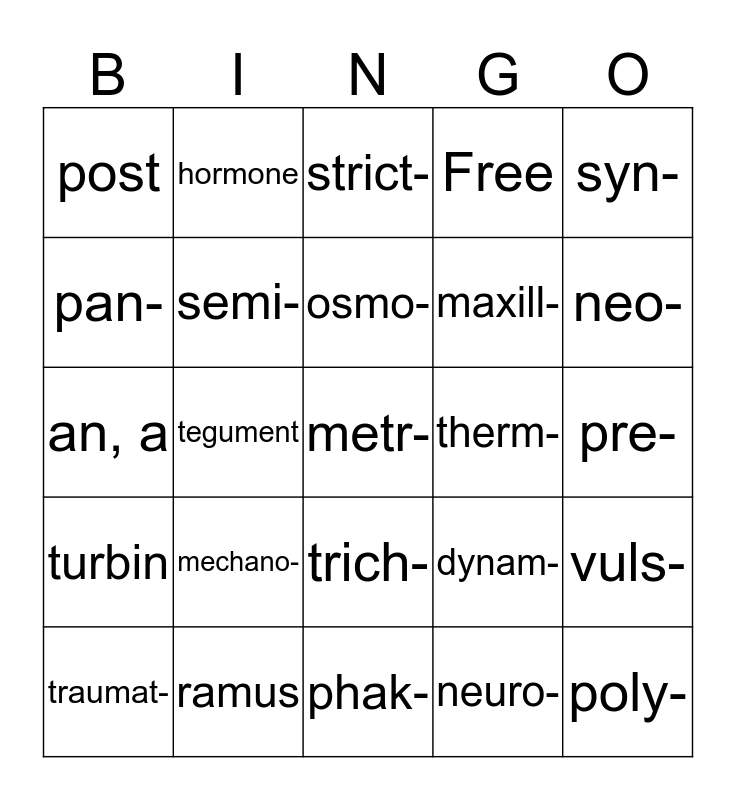 This bingo card has a free space and 25 words: mechano-, phak-, osmo-, traumat-, syn-, post, pan-, hormone, therm-, trich-, maxill-, an, a, dynam-, vuls-, semi-, ameb-, pre-, strict-, neo-, tegument, poly-, ramus, turbin, Free and neuro-.