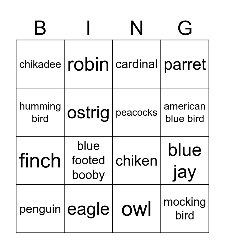 This bingo card has 16 words: eagle, blue jay, cardinal, chikadee, finch, robin, chiken, owl, humming bird, ostrig, penguin, parret, blue footed booby, american blue bird, peacocks and mocking bird.