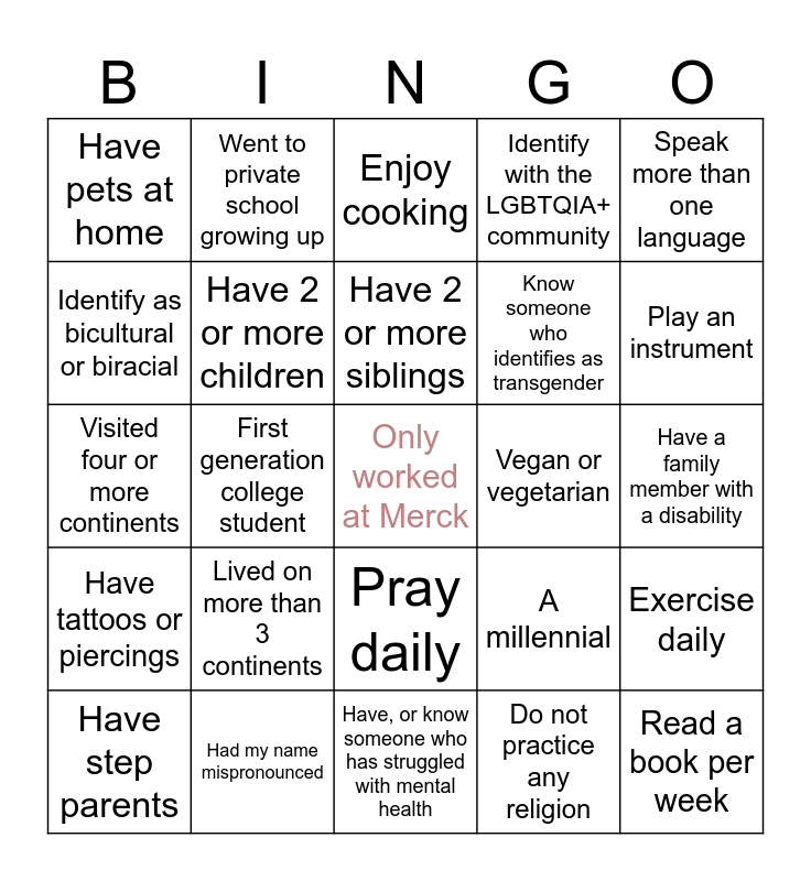 This bingo card has a free space and 24 words: Lived on more than 3 continents, Had my name mispronounced, Have 2 or more siblings, Have step parents, Speak more than one language, Have pets at home, Identify as bicultural or biracial, Went to private school growing up, Vegan or vegetarian, Pray daily, Know someone who identifies as transgender, Visited four or more continents, A millennial, Exercise daily, Have 2 or more children, Do not practice any religion, Have a family member with a disability, Enjoy cooking, Play an instrument, First generation college student, Read a book per week, Have tattoos or piercings, Identify with the LGBTQIA+ community and Have, or know someone who has struggled with mental health.
