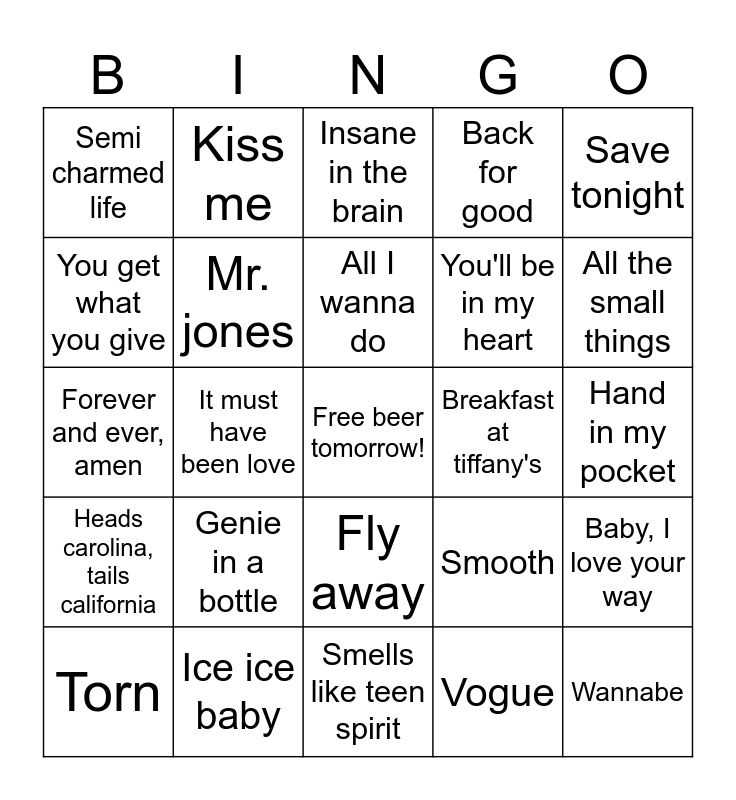 This bingo card has a free space and 53 words: I want it that way, Wannabe, Livin' la vida loca, Vogue, Genie in a bottle, Say my name, Kiss me, Only wanna be with you, You get what you give, Ironic, Mr. jones, Don't speak, Baby, I love your way, Smooth, Tom's diner, Torn, All I wanna do, Breakfast at tiffany's, That don't impress me much, Save tonight, It must have been love, What is love, You'll be in my heart, Semi charmed life, California love, Ice ice baby, Jump around, Return of the mack, ...baby one more time, All the small things, Thank you, It wasn't me, Californication, Truly madly deeply, Knockin' on heaven's door, Criminal, Back for good, Smells like teen spirit, Insane in the brain, Iris, She's so high, My boo, Hand in my pocket, 3AM, Loser, Fly away, How bizarre, When I come around, Forever and ever, amen, Heads carolina, tails california, Carrying your love with me, I like it, I love it and Life is a highway.