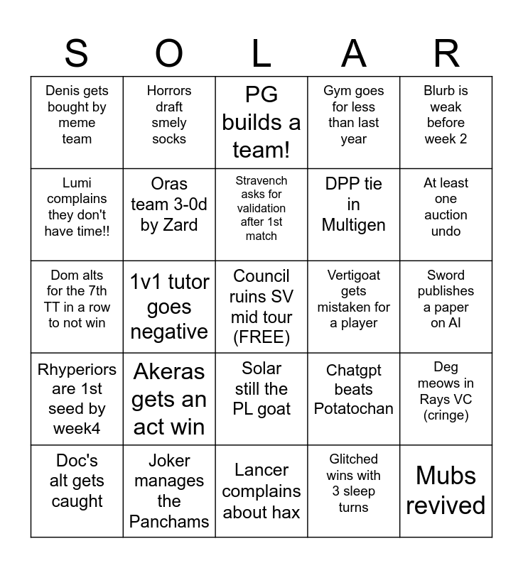 This bingo card has a free space and 24 words: Akeras gets an act win, Joker manages the Panchams, Stravench asks for validation after 1st match, Doc's alt gets caught, Blurb is weak before week 2, Denis gets bought by meme team, Lumi complains they don't have time!!, Horrors draft smely socks, Vertigoat gets mistaken for a player, Solar still the PL goat, DPP tie in Multigen, Dom alts for the 7th TT in a row to not win, Chatgpt beats Potatochan, Deg meows in Rays VC (cringe), Oras team 3-0d by Zard, Glitched wins with 3 sleep turns, Sword publishes a paper on AI, PG builds a team!, At least one auction undo, 1v1 tutor goes negative, Mubs revived, Rhyperiors are 1st seed by week4, Gym goes for less than last year and Lancer complains about hax.