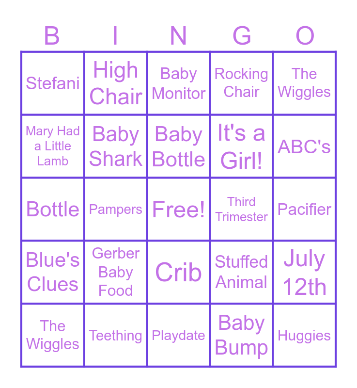 This bingo card has a free space and 39 words: Diaper bag, Humpty Dumpty, Baa Baa Black Sheep, Baby Shark, The Wiggles, Crib, Baby Bottle, Rattle, The Wiggles, Blue's Clues, Pampers, Rocking Chair, Huggies, Pacifier, Third Trimester, Gerber Baby Food, Itsy Bitsy Spider, Stefani, Sesame Street, Stuffed Animal, Mary Had a Little Lamb, Playdate, It's a Girl!, ABC's, Thomas the Tank Engine, Socks, Onesie, Cocomelon, Burp Cloth, High Chair, Baby Powder, Car Seat, Baby Monitor, Teething, Baby Bump, Nap Time, July 12th, Bottle and Mom.