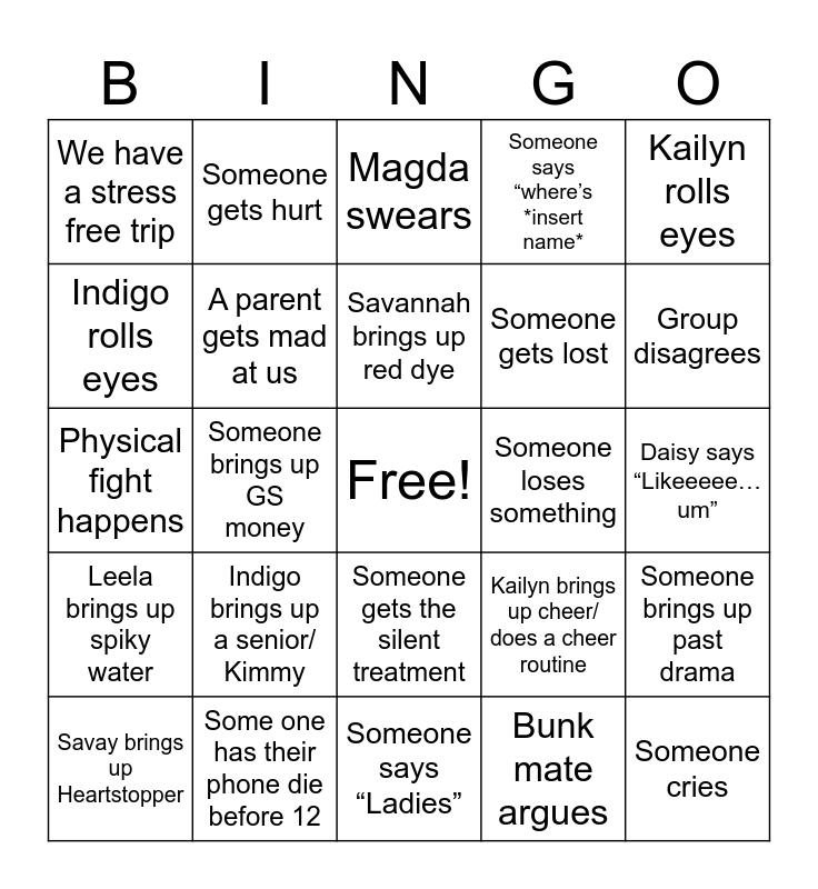 This bingo card has a free space and 24 words: Indigo brings up a senior/ Kimmy, Some one has their phone die before 12, Savannah brings up red dye, Savay brings up Heartstopper, Kailyn rolls eyes, We have a stress free trip, Indigo rolls eyes, Someone gets hurt, Someone loses something, Someone gets the silent treatment, Someone gets lost, Physical fight happens, Kailyn brings up cheer/ does a cheer routine, Someone brings up past drama, A parent gets mad at us, Bunk mate argues, Daisy says “Likeeeee…um”, Magda swears, Group disagrees, Someone brings up GS money, Someone cries, Leela brings up spiky water, Someone says “where’s *insert name* and Someone says “Ladies”.