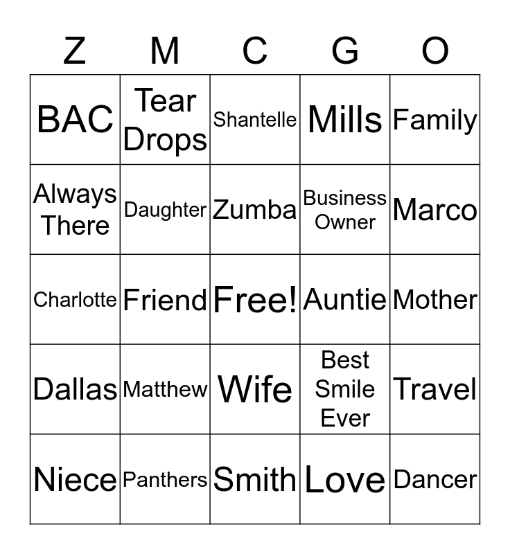 This bingo card has a free space and 24 words: Matthew, Panthers, Zumba, Niece, Family, BAC, Always There, Tear Drops, Auntie, Wife, Business Owner, Charlotte, Best Smile Ever, Travel, Daughter, Love, Mother, Shantelle, Marco, Friend, Dancer, Dallas, Mills and Smith.