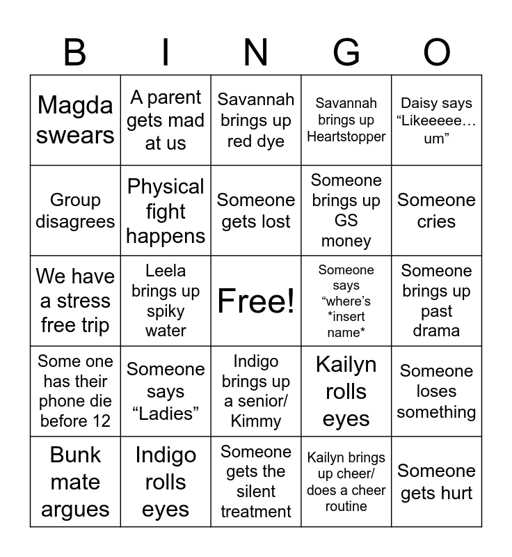 This bingo card has a free space and 24 words: Someone says “Ladies”, Indigo rolls eyes, Someone gets lost, Bunk mate argues, Daisy says “Likeeeee…um”, Magda swears, Group disagrees, A parent gets mad at us, Someone says “where’s *insert name*, Indigo brings up a senior/ Kimmy, Someone brings up GS money, We have a stress free trip, Kailyn rolls eyes, Someone loses something, Physical fight happens, Kailyn brings up cheer/ does a cheer routine, Someone brings up past drama, Savannah brings up red dye, Someone cries, Leela brings up spiky water, Someone gets hurt, Some one has their phone die before 12, Savannah brings up Heartstopper and Someone gets the silent treatment.