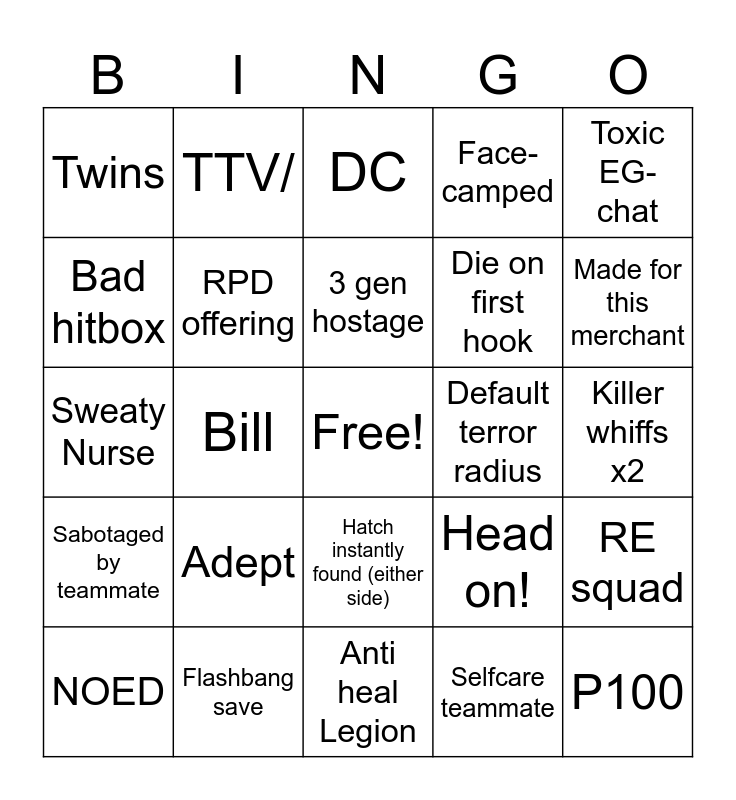 This bingo card has a free space and 24 words: Adept, Flashbang save, 3 gen hostage, NOED, Toxic EG-chat, Twins, Bad hitbox, TTV/, Default terror radius, Hatch instantly found (either side), Die on first hook, Sweaty Nurse, Head on!, RE squad, RPD offering, Selfcare teammate, Killer whiffs x2, DC, Made for this merchant, Bill, P100, Sabotaged by teammate, Face-camped and Anti heal Legion.