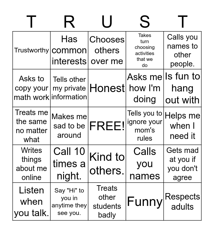 This bingo card has a free space and 24 words: Call 10 times a night., Say "Hi" to you in anytime they see you., Honest, Listen when you talk., Calls you names to other people., Trustworthy, Asks to copy your math work, Has common interests, Tells you to ignore your mom's rules, Kind to others., Asks me how I'm doing, Treats me the same no matter what, Calls you names, Gets mad at you if you don't agree, Tells other my private information, Funny, Helps me when I need it, Chooses others over me, Is fun to hang out with, Makes me sad to be around, Respects adults, Writes things about me online, Takes turn choosing activities that we do and Treats other students badly.