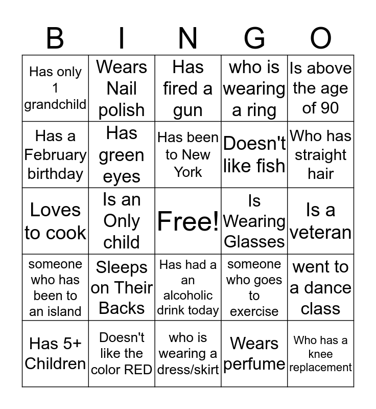 This bingo card has a free space and 24 words: Sleeps on Their Backs, Doesn't like the color RED, Has been to New York, Has 5+ Children, Is above the age of 90, Has only 1 grandchild, Has a February birthday, Wears Nail polish, Is Wearing Glasses, Has had a an alcoholic drink today, Doesn't like fish, Loves to cook, someone who goes to exercise, went to a dance class, Has green eyes, Wears perfume, Is a veteran, Has fired a gun, Who has straight hair, Is an Only child, Who has a knee replacement, someone who has been to an island, who is wearing a ring and who is wearing a dress/skirt.