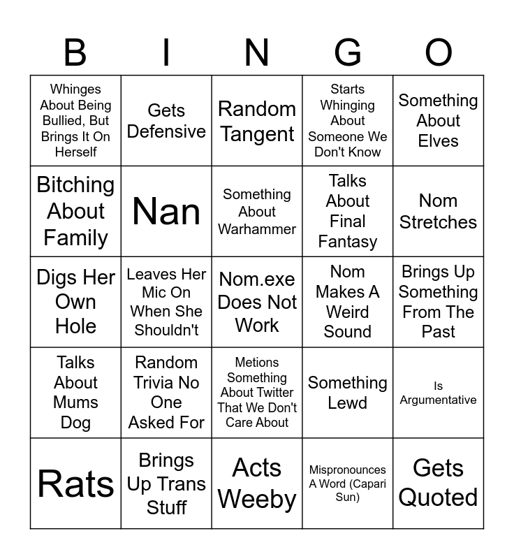 This bingo card has a free space and 24 words: Rats, Random Trivia No One Asked For, Something About Warhammer, Mispronounces A Word (Capari Sun), Something About Elves, Whinges About Being Bullied, But Brings It On Herself, Gets Defensive, Random Tangent, Nom Makes A Weird Sound, Brings Up Something From The Past, Digs Her Own Hole, Nan, Something Lewd, Is Argumentative, Bitching About Family, Brings Up Trans Stuff, Acts Weeby, Starts Whinging About Someone We Don't Know, Nom Stretches, Talks About Mums Dog, Leaves Her Mic On When She Shouldn't, Metions Something About Twitter That We Don't Care About, Talks About Final Fantasy and Gets Quoted.