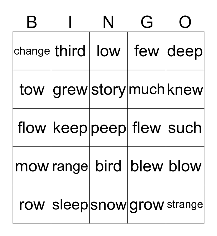 This bingo card has a free space and 24 words: range, sleep, story, row, deep, change, tow, third, flew, bird, much, flow, blew, blow, grew, grow, such, low, knew, keep, strange, mow, few and snow.