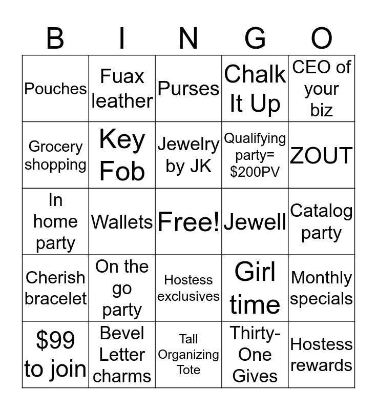 This bingo card has a free space and 60 words: Morning Glow necklace, Bevel Letter charms, Dream Catcher necklace, Cherish bracelet, Thirty-One Gives, Round Up, Key Fob, Opportunity, Qualifying party= $200PV, Vibrant colors, Chalk It Up, Traveling, Grocery shopping, Oh Snap!, Littles Caddy, Pouches, Hostess rewards, CEO of your biz, Thirty-One, Jewelry by JK, Jewell, Purses, $99 to join, Monthly specials, Totes, LUT, DUT, SUT, ZOUT, Utility, Organize, Crossbody, Accessories, Thermals, Fuax leather, Double Duty Caddy, Cinch sac, Wallets, Functional solutions, In home party, Online party, On the go party, Catalog party, Friends, Girl time, Proverbs 31, Fresh Market, Pillow covers, Essential Storage Tote, Hostess exclusives, Tall Organizing Tote, Core Values, Products for home, Products for car, Products for office, Personalization, Icon-Its, Fun patterns, Startswell and Build your team.