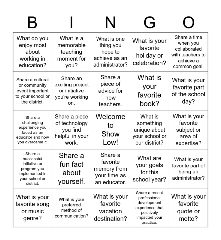 This bingo card has a free space and 24 words: Share a fun fact about yourself., What is your preferred method of communication?, Share a piece of advice for new teachers., What is your favorite song or music genre?, Share a time when you collaborated with teachers to achieve a common goal., What do you enjoy most about working in education?, Share a cultural or community event important to your school or the district., What is a memorable teaching moment for you?, What is something unique about your school or our district?, Share a favorite memory from your time as an educator., What is your favorite book?, Share a challenging experience you faced as an educator and how you overcame it., What are your goals for this school year?, What is your favorite part of being an administrator?, Share an exciting project or initiative you're working on., Share a recent professional development experience that positively impacted your practice., What is your favorite subject or area of expertise?, What is one thing you hope to achieve as an administrator?, What is your favorite part of the school day?, Share a piece of technology you find helpful in your work., What is your favorite quote or motto?, Share a successful initiative or program you implemented in your school or district., What is your favorite holiday or celebration? and What is your favorite vacation destination?.