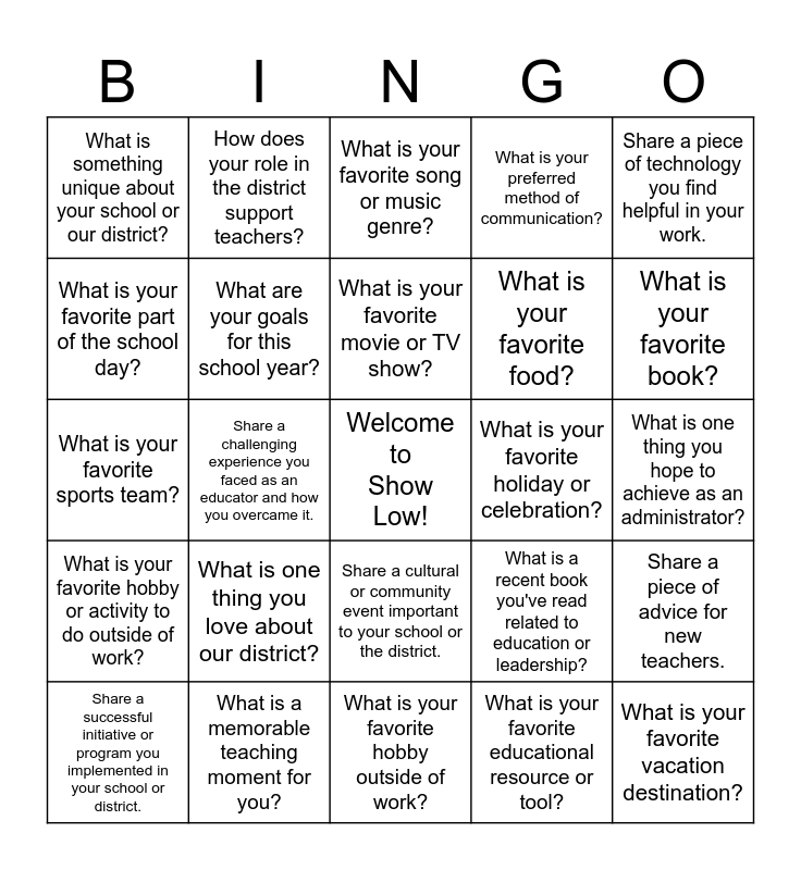 This bingo card has a free space and 24 words: What is one thing you love about our district?, What is a memorable teaching moment for you?, What is your favorite movie or TV show?, Share a successful initiative or program you implemented in your school or district., Share a piece of technology you find helpful in your work., What is something unique about your school or our district?, What is your favorite part of the school day?, How does your role in the district support teachers?, What is your favorite holiday or celebration?, Share a cultural or community event important to your school or the district., What is your favorite food?, What is your favorite sports team?, What is a recent book you've read related to education or leadership?, Share a piece of advice for new teachers., What are your goals for this school year?, What is your favorite educational resource or tool?, What is one thing you hope to achieve as an administrator?, What is your favorite song or music genre?, What is your favorite book?, Share a challenging experience you faced as an educator and how you overcame it., What is your favorite vacation destination?, What is your favorite hobby or activity to do outside of work?, What is your preferred method of communication? and What is your favorite hobby outside of work?.
