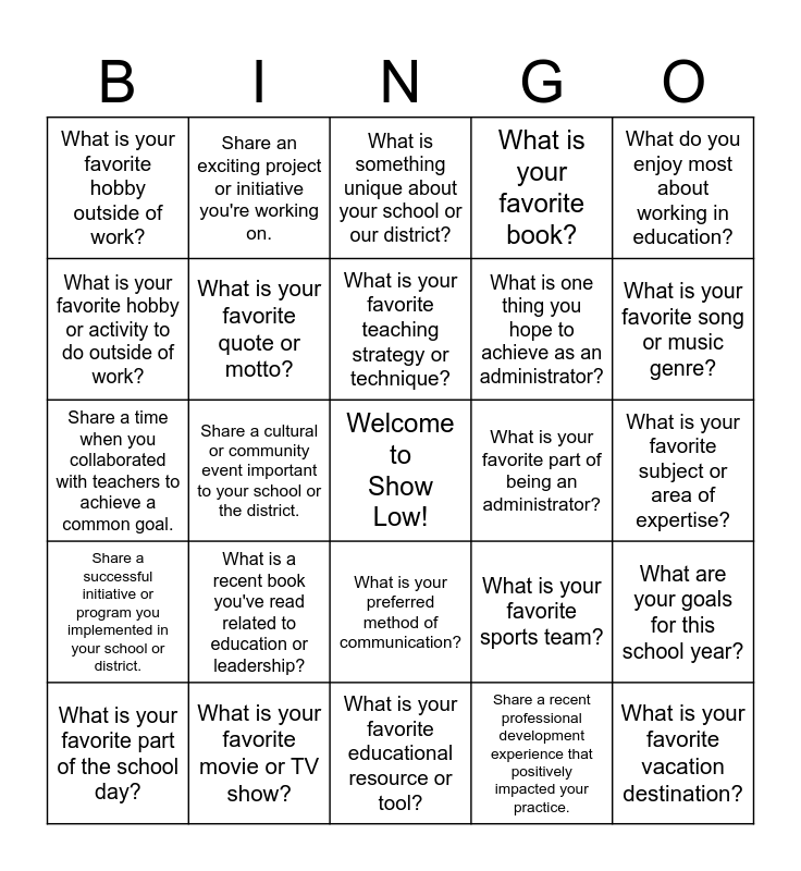 This bingo card has a free space and 24 words: What is a recent book you've read related to education or leadership?, What is your favorite movie or TV show?, What is your favorite teaching strategy or technique?, What is your favorite part of the school day?, What do you enjoy most about working in education?, What is your favorite hobby outside of work?, What is your favorite hobby or activity to do outside of work?, Share an exciting project or initiative you're working on., What is your favorite part of being an administrator?, What is your preferred method of communication?, What is one thing you hope to achieve as an administrator?, Share a time when you collaborated with teachers to achieve a common goal., What is your favorite sports team?, What are your goals for this school year?, What is your favorite quote or motto?, Share a recent professional development experience that positively impacted your practice., What is your favorite subject or area of expertise?, What is something unique about your school or our district?, What is your favorite song or music genre?, Share a cultural or community event important to your school or the district., What is your favorite vacation destination?, Share a successful initiative or program you implemented in your school or district., What is your favorite book? and What is your favorite educational resource or tool?.