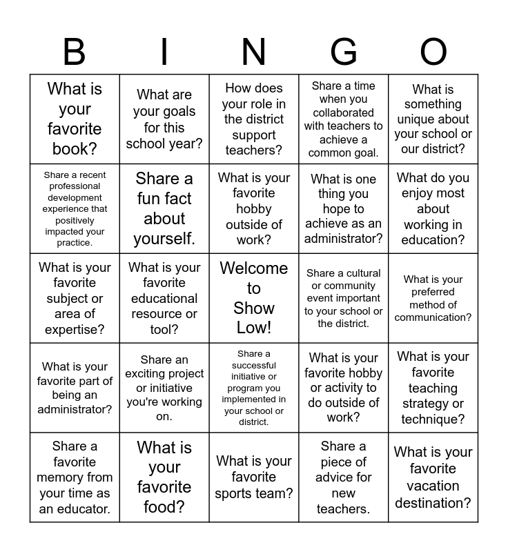 This bingo card has a free space and 24 words: Share an exciting project or initiative you're working on., What is your favorite food?, What is your favorite hobby outside of work?, Share a favorite memory from your time as an educator., What is something unique about your school or our district?, What is your favorite book?, Share a recent professional development experience that positively impacted your practice., What are your goals for this school year?, Share a cultural or community event important to your school or the district., Share a successful initiative or program you implemented in your school or district., What is one thing you hope to achieve as an administrator?, What is your favorite subject or area of expertise?, What is your favorite hobby or activity to do outside of work?, What is your favorite teaching strategy or technique?, Share a fun fact about yourself., Share a piece of advice for new teachers., What is your preferred method of communication?, How does your role in the district support teachers?, What do you enjoy most about working in education?, What is your favorite educational resource or tool?, What is your favorite vacation destination?, What is your favorite part of being an administrator?, Share a time when you collaborated with teachers to achieve a common goal. and What is your favorite sports team?.