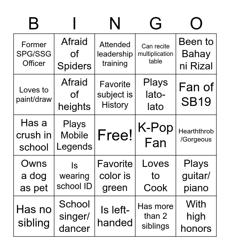 This bingo card has a free space and 24 words: Is wearing school ID, School singer/ dancer, Favorite subject is History, Has no sibling, Been to Bahay ni Rizal, Former SPG/SSG Officer, Loves to paint/draw, Afraid of Spiders, K-Pop Fan, Favorite color is green, Plays lato-lato, Has a crush in school, Loves to Cook, Plays guitar/ piano, Afraid of heights, Has more than 2 siblings, Hearththrob /Gorgeous, Attended leadership training, Fan of SB19, Plays Mobile Legends, With high honors, Owns a dog as pet, Can recite multiplication table and Is left-handed.