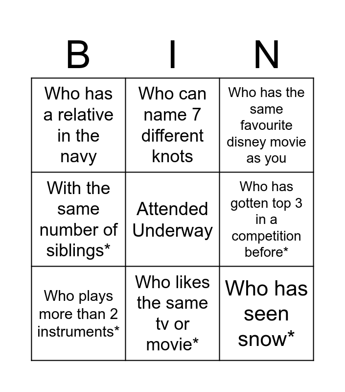 This bingo card has a free space and 17 words: With a disney character name, Who has sailed on a boat before joining the navy, Who has the same favourite disney movie as you, Who has a relative in the navy, Who speaks more than 2 languages, With the same number of siblings*, With more than 2 pets*, Who plays more than 2 instruments*, Who likes the same tv or movie*, Who has gotten top 3 in a competition before*, Who has a friend of more than 5 years*, Who stays on the same MRT line*, Who has seen snow*, Who can name 7 different knots, Who can name the 7 dwarves from snow white*, Who can cook a proper meal and Who has has travelled to at least 3 continents.