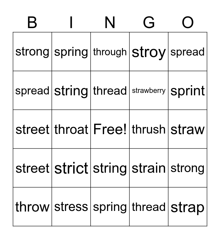 This bingo card has a free space and 32 words: thread, through, throat, throw, street, string, spread, strong, spring, sprite, thread, through, throat, three, thrush, thrash, throw, street, string, strict, strain, struck, straw, stress, strap, stroy, strawberry, spread, strong, spring, sprite and sprint.
