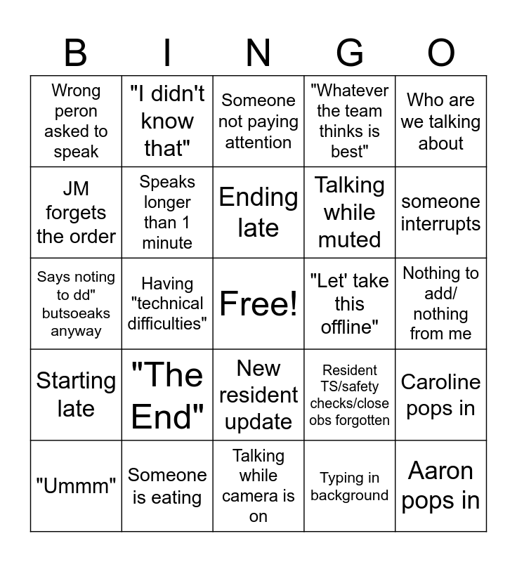 This bingo card has a free space and 24 words: "The End", Someone is eating, Ending late, "Ummm", Who are we talking about, Wrong peron asked to speak, JM forgets the order, "I didn't know that", "Let' take this offline", New resident update, Talking while muted, Says noting to dd" butsoeaks anyway, Resident TS/safety checks/close obs forgotten, Caroline pops in, Speaks longer than 1 minute, Typing in background, Nothing to add/ nothing from me, Someone not paying attention, someone interrupts, Having "technical difficulties", Aaron pops in, Starting late, "Whatever the team thinks is best" and Talking while camera is on.
