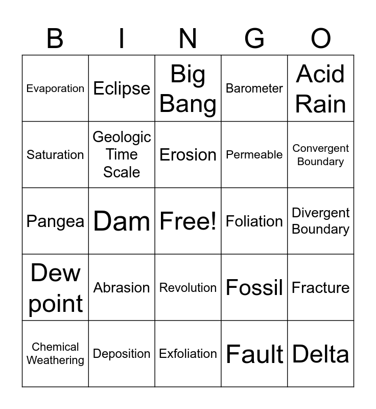 This bingo card has a free space and 24 words: Abrasion, Deposition, Erosion, Chemical Weathering, Acid Rain, Evaporation, Saturation, Eclipse, Foliation, Revolution, Permeable, Pangea, Fossil, Fracture, Geologic Time Scale, Fault, Divergent Boundary, Big Bang, Convergent Boundary, Dam, Delta, Dew point, Barometer and Exfoliation.