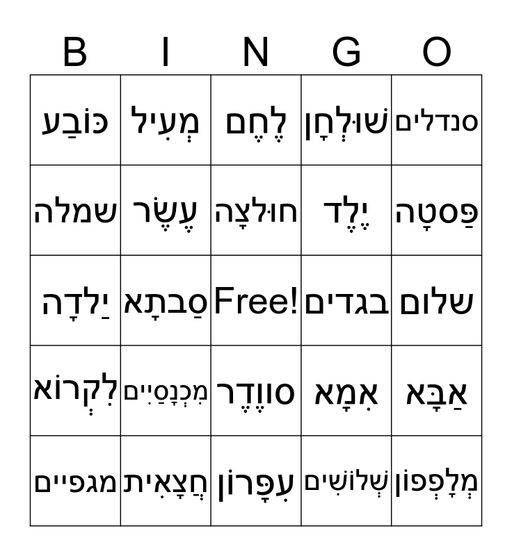 This bingo card has a free space and 24 words: מִכְנָסַיִים, חֲצָאִית, חוּלצָה, מגפיים, סנדלים, כּוֹבַע, שמלה, מְעִיל, בגדים, סווֶדֶר, יֶלֶד, יַלדָה, אִמָא, אַבָּא, עֶשֶׂר, שְׁלוֹשִׁים, שלום, לֶחֶם, פַּסטָה, סַבתָא, מְלָפְפוֹן, לִקְרוֹא, שׁוּלְחָן and עִפָּרוֹן.