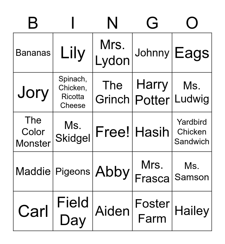 This bingo card has a free space and 24 words: Pigeons, Field Day, The Grinch, Carl, Eags, Bananas, Jory, Lily, Hasih, Abby, Harry Potter, The Color Monster, Mrs. Frasca, Ms. Samson, Spinach, Chicken, Ricotta Cheese, Foster Farm, Yardbird Chicken Sandwich, Mrs. Lydon, Ms. Ludwig, Ms. Skidgel, Hailey, Maddie, Johnny and Aiden.